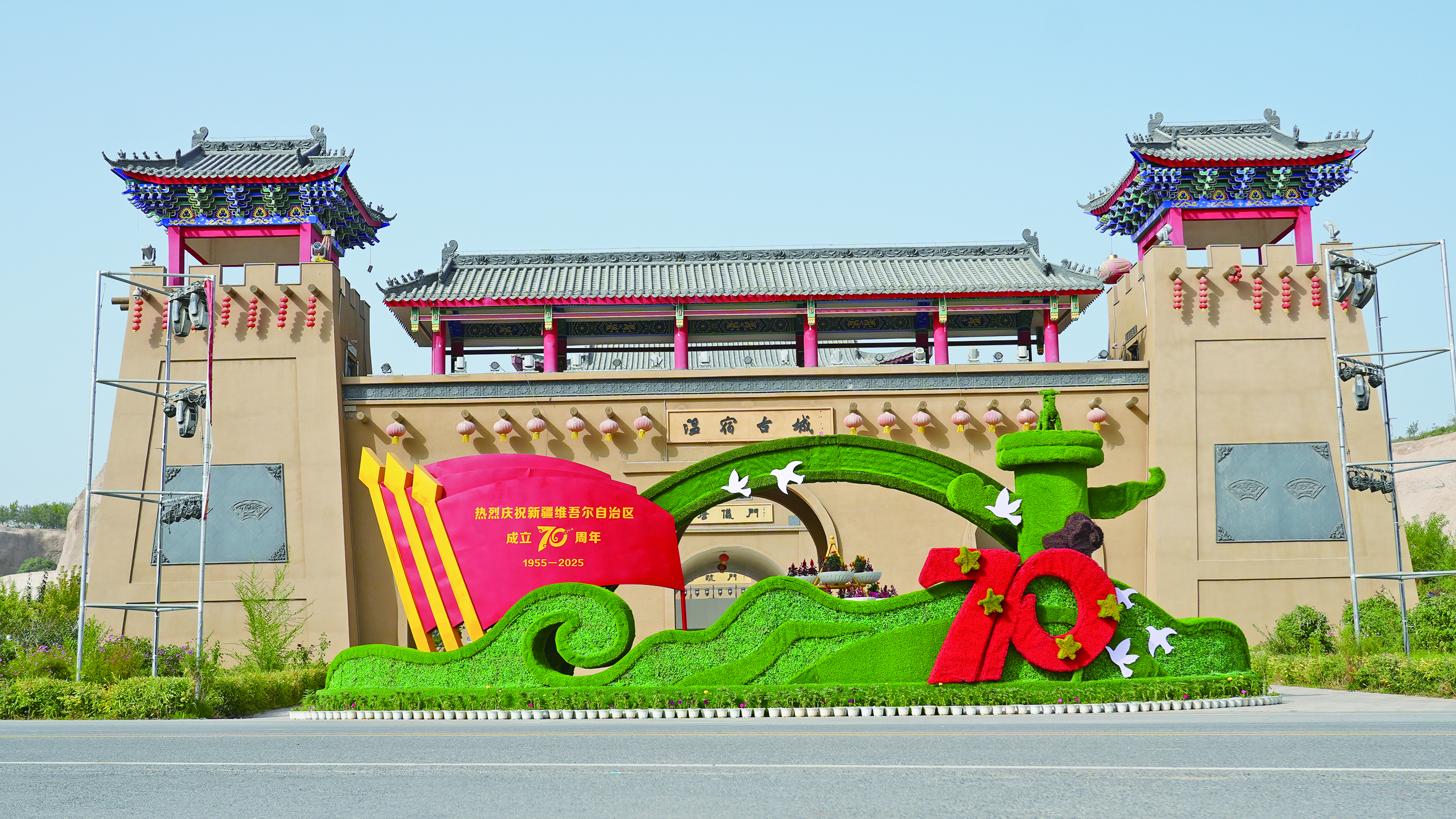 2025年9月21日,溫宿古城前搭建起以“慶祝新疆維吾爾自治區(qū)成立70周年”為主題的城市綠雕! ⊥ㄓ崋T 趙新昌 攝
