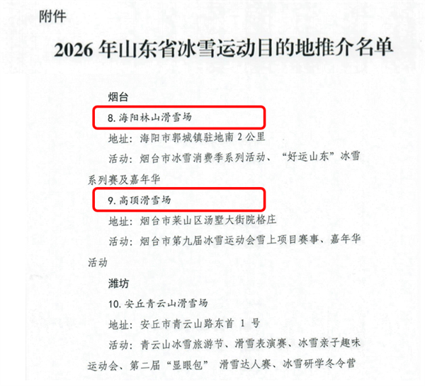 近日,山東省體育局公布“好運(yùn)山東”2026年冰雪運(yùn)動(dòng)目的地推介名單,我市海陽(yáng)林山滑雪場(chǎng)和高頂滑雪場(chǎng)成功入選,為煙臺(tái)冰雪產(chǎn)業(yè)版圖注入了新的活力與機(jī)遇,也為全省冰雪愛(ài)好者提供了冬日出行新選擇。